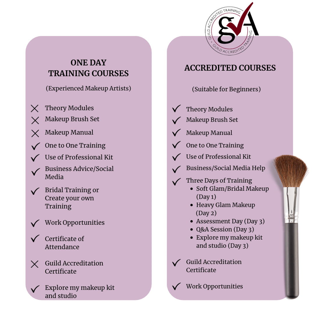 Your makeup training will have no set time! However, I would allow up to 3-3.5 hours for your course, this will allow you time to perfect the makeup, take some beautiful photos for your portfolio (we can also take some in the garden) to showcase your new skills and you can ask me as many questions as you like to.